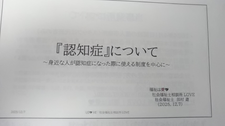 昨日(2025.12.7)、当事業所主催研修会”『認知症』について~身近な人が認知症になった際に使える制度を中心に~”(2回目)を開催致しました。