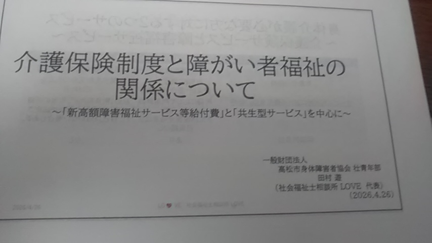 今日は、「一般財団法人 高松市身体障害者協会」壮青年部 様からのご依頼で、『介護保険制度と障がい者福祉の関係について』研修をさせて頂きました。